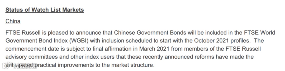 富时罗素此次宣布,中国国债将被纳入其固定收益指数的旗舰产品WGBI,预计2021年10月开始纳入。具体纳入时间仍有待富时罗素咨询委员会和其他指数用户在2021年3月份正式确认。