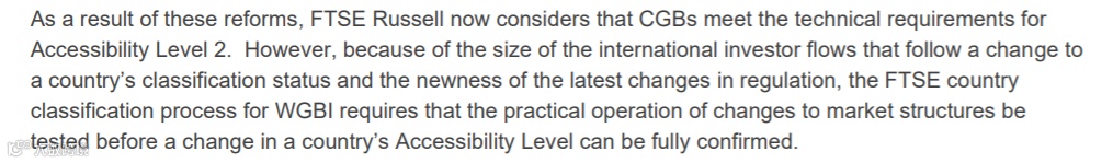 富时罗素认为,中国政府债券现在已经满足LEVEL 2的技术要求。但鉴于追踪国家分类变化的资金规模和一些监管变革刚刚实施,在完全确认国家分类变化之前,还需要进一步检验市场改革的实际操作情况。