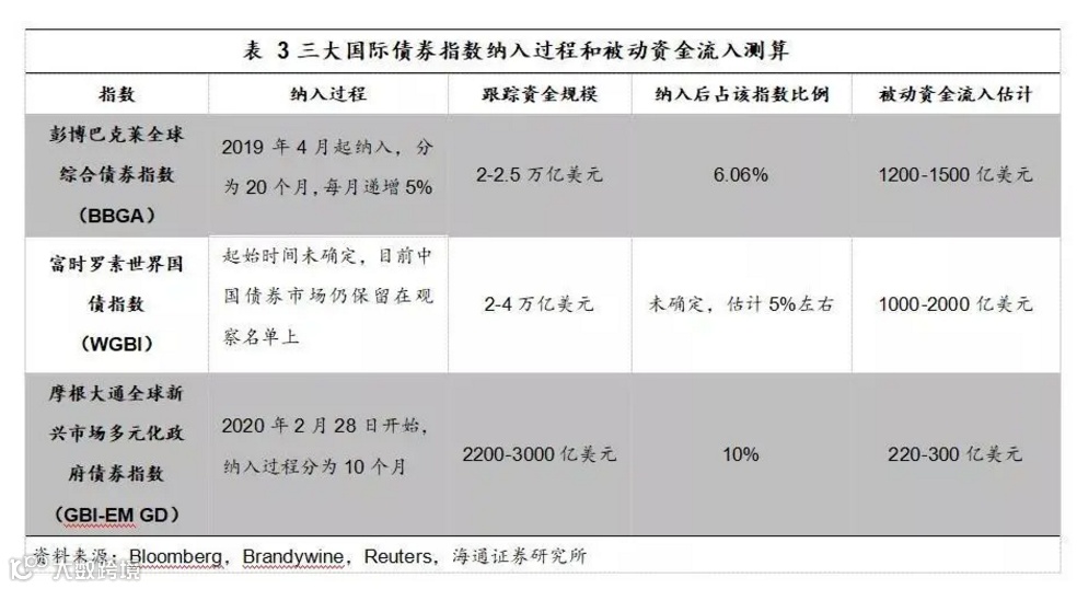 纳入指数最直接的意义是有望带来可观的增量资金流入。据海通证券估计,纳入三大国际债券指数将带来约2420亿-3800亿美元被动跟踪资金的流入。