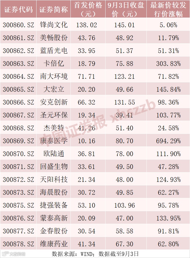 截至9月3日收盘,18只新股最新股价较各自发行价的平均涨幅为124.52%。其中涨幅最大的康泰医学,较发行价上涨694.29%;锋尚文化较发行价的涨幅仅有5.06%。