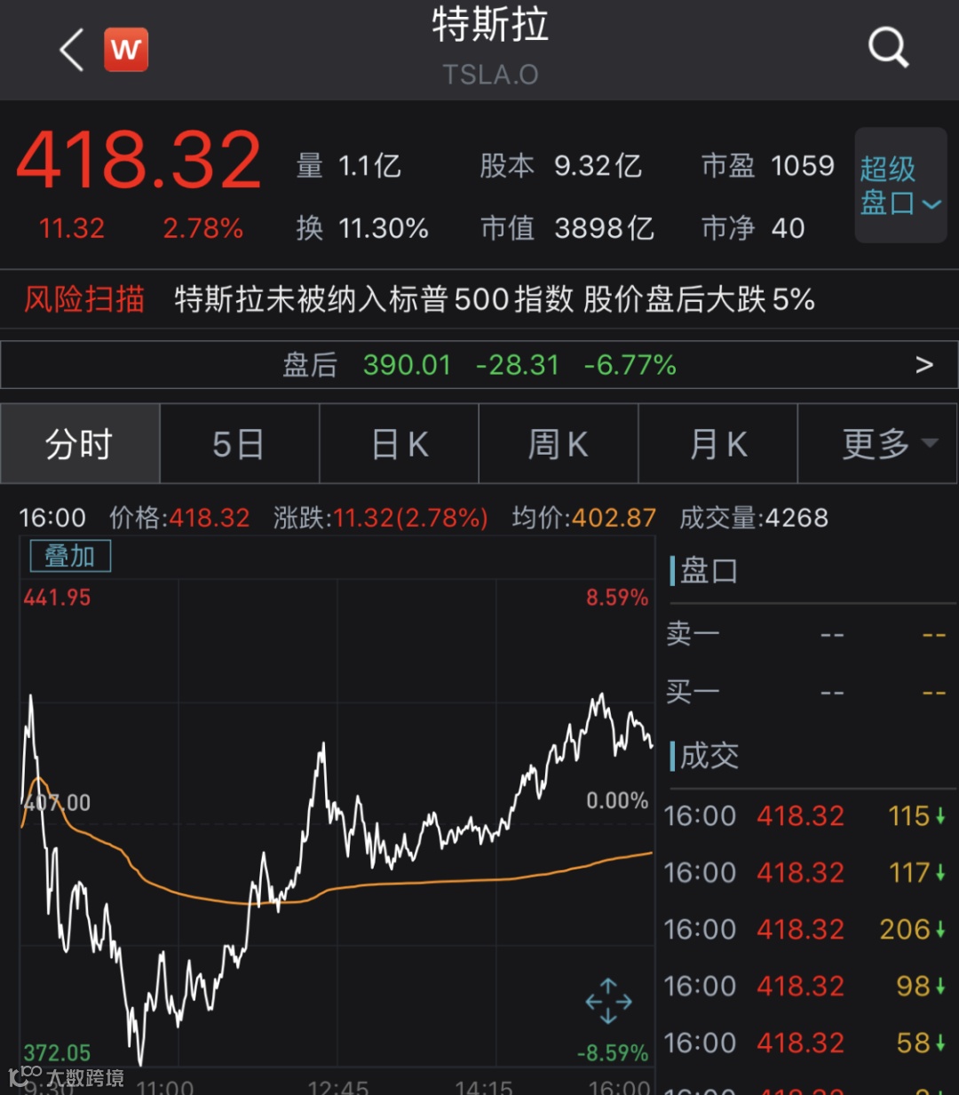 特斯拉上涨2.78%,报418.32美元,最新市值为3898亿美元。