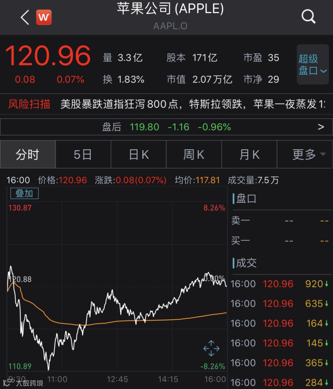 截至当日收盘,苹果公司上涨0.07%,报120.96美元,最新市值为2.07万亿美元。