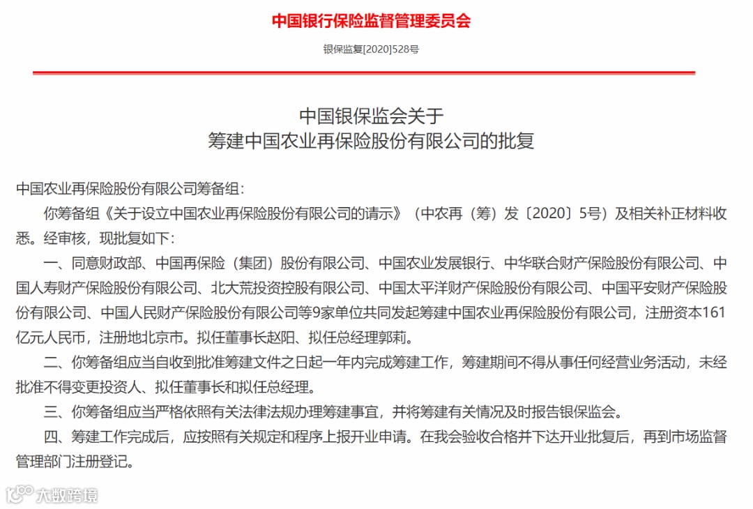 日前,银保监会批复同意筹建中国农业再保险股份有限公司。