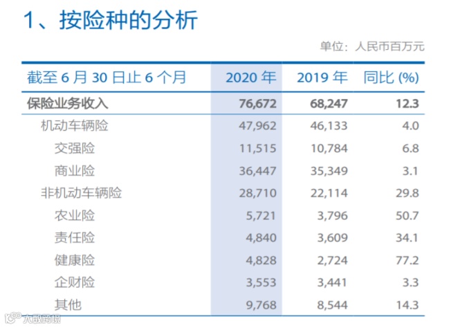 据中国太保2020年半年报,太保产险上半年农险业务收入 57.21 亿元,同比增长 50.7%。以太保产险上半年保险业务收入766.72亿元计算,农险占比7.46%,同比提高近2个百分点。