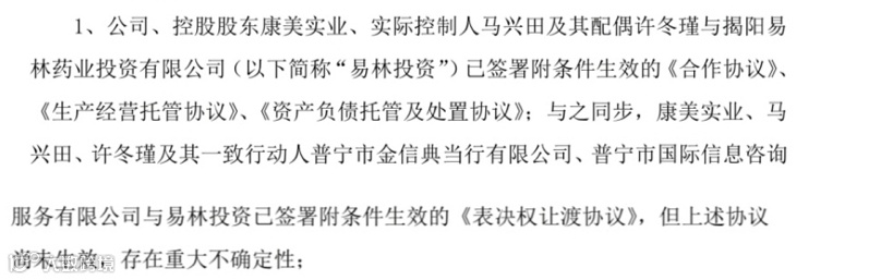 此前,ST康美公告,公司与揭阳易林药业投资有限公司(简称“易林投资”)签署托管协议。股权穿透后,接盘方易林投资背后的3名股东均有国资背景。