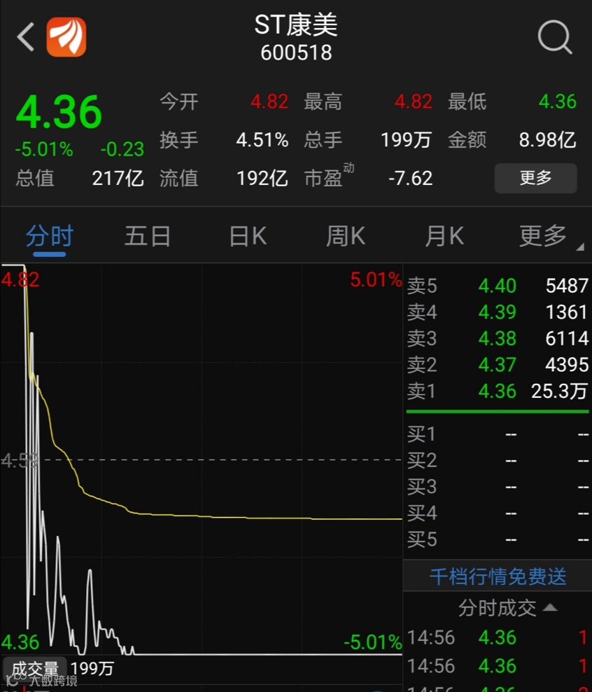 今日,ST康美开盘继续涨停。当投资者以为它要迎来第12个涨停板时,9点42分,ST康美突然跳水,股价剧烈震荡,最后在10点50分被按死在跌停板上。截至收盘,ST康美报4.36元/股,跌幅达5.01%,全天振幅达10.02%,成交额为8.98亿元。
