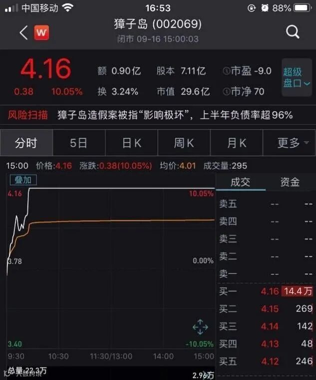 消息一出,獐子岛将海底扇贝动产抵押一度登上热搜。16日开盘后,獐子岛股价迅速飙升涨停,截至收盘报4.16元/股。