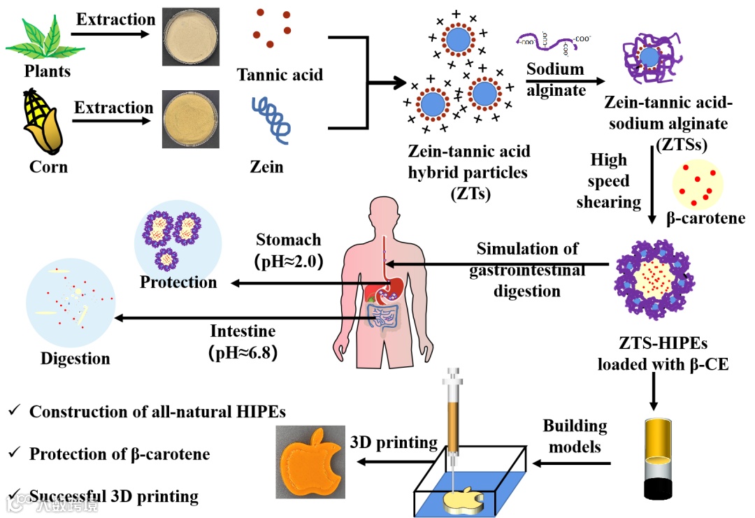 图1 ZTSs和ZTS HIPE的制备试图;ZTS-HIPEs在包埋β-胡萝卜素和3D食品打印中的应用。