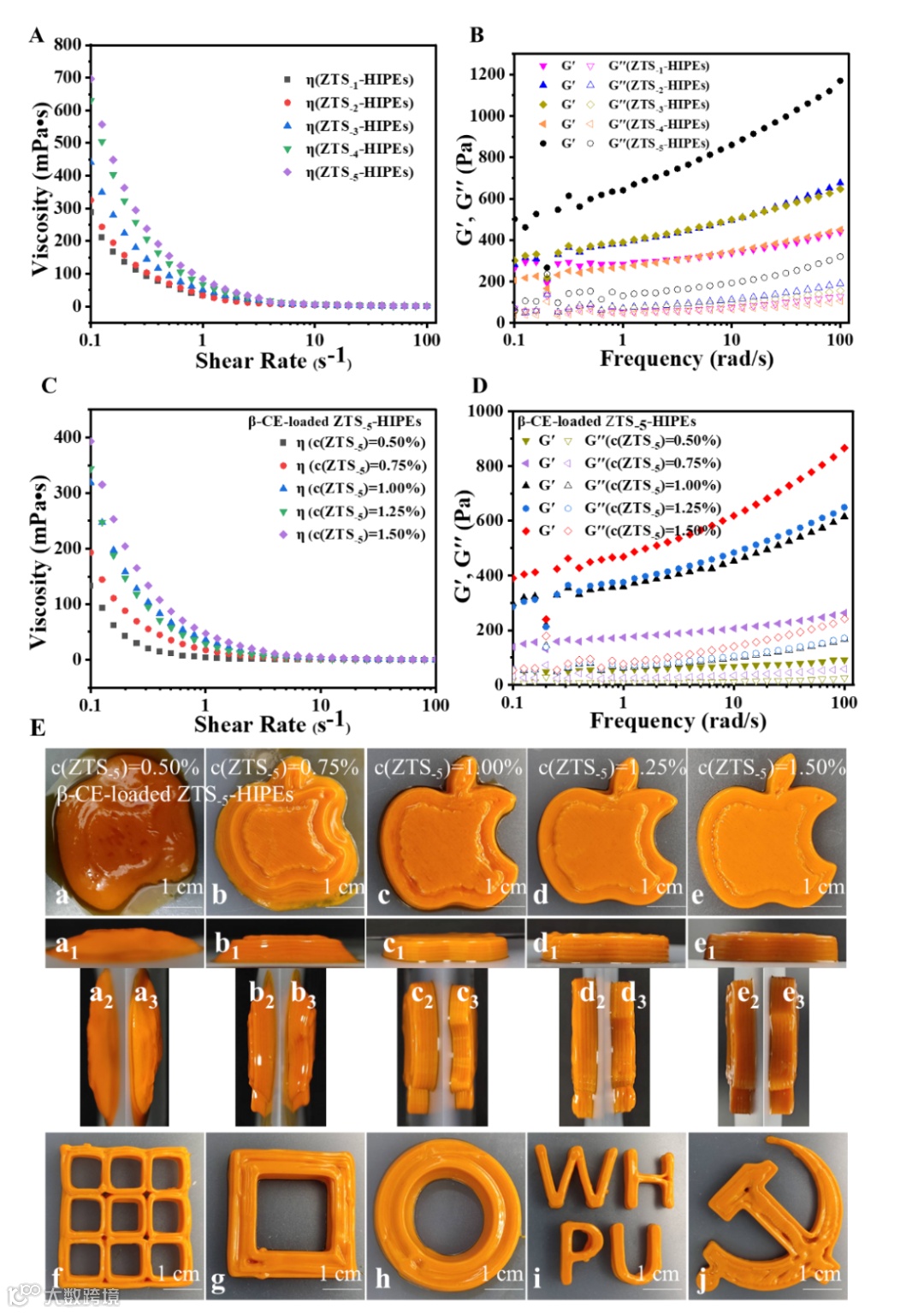 图3 ZTS-1-HIPEs、ZTS-2-HIPEs和ZTS-3-HIPEs,ZTS-4-HIPEs和ZTS-5-HIPEs的(A)剪切粘度曲线、(B)储能模量(G′)和损耗模量(G′′)。不同颗粒浓度(0.5-1.5 wt%)的ZTS-5稳定的包埋β-CE的HIPEs的(C)剪切粘度、(D)储能模量(G′)和损耗模量(G′′)。E:a-e:不同浓度的ZTS-5(0.5%-1.5%)稳定的负载β-CE的HIPEs的3D打印模型的照片。包括俯视图(a-e)、正视图(a1-e1)和侧视图(左:a2-e2,右:a3-e3)。f-j:ZTS-5(1.5%)稳定的β-CE负载HIPEs的不同3D打印模型的照片。比例尺为1厘米。