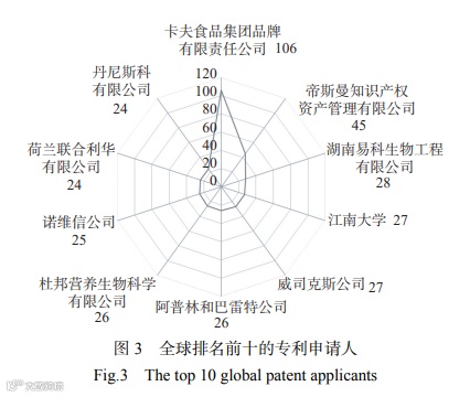 如图3可知,Nisin在食品贮藏保鲜应用领域,卡夫食品集团品牌有限责任公司(以下简称“卡夫食品”)专利申请量遥遥领先于其他专利申请人,该公司主要围绕奶酪、面包等食品贮藏保鲜技术进行研发;其次是帝斯曼知识产权资产管理有限公司,它是荷兰皇家帝斯曼集团知识产权的管理人,配合帝斯曼集团在全球推进各领域业务发展,帝斯曼集团在该领域侧重于研发含有Nisin的复合保鲜剂;此外,其他的专利申请人之间专利申请量相差较小。
