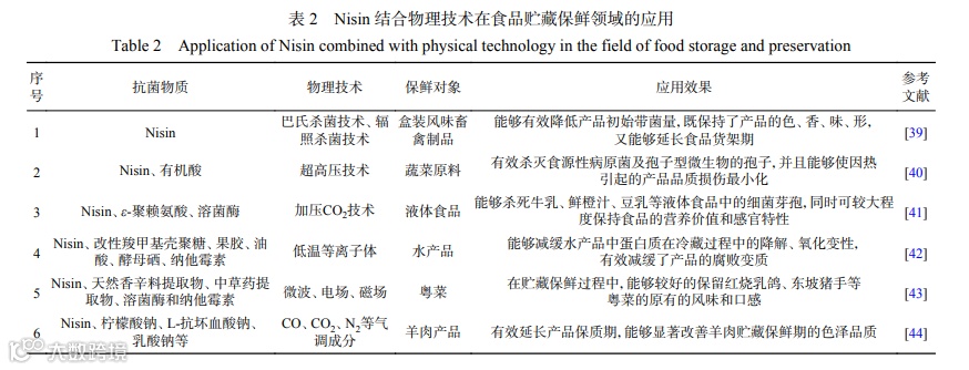 栅栏技术是将多种不同的保藏技术联合抑制食品中微生物生长繁殖,近年来被广泛应用到食品工业中。Nisin作为栅栏技术的一部分,引起了一些专家学者的持续关注。Nisin与物理技术,或Nisin、其他抗菌抗氧化物质与物理技术联合使用,均能够有效抑制食品中微生物引起的食品腐败变质,最大限度保留食品营养价值,提升食品品质。本文检索到77件与物理技术协同杀菌类专利中,涉及到的物理技术主要有超高压方法、低压电场、辐照、等离子体、电磁场、巴氏杀菌、气调保藏等,如表2,上述物理技术与Nisin等抗菌物质联合使用,均达到了较为理想的食品贮藏保鲜效果。
