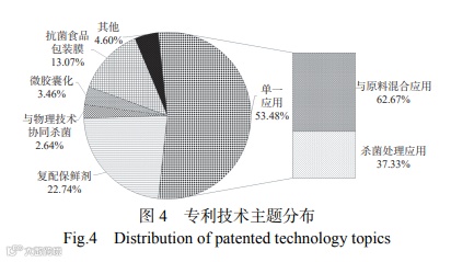 虽然Nisin杀菌范围较广,对大部分革兰氏阳性菌具有较强的杀菌作用,然而,一般情况下Nisin对革兰氏阴性菌、酵母菌、霉菌无抑制作用。因此,将Nisin与其他物质复配成复合保鲜剂,应用在食品贮藏保鲜领域,可以扩宽Nisin的抑菌谱,延长食品的货架期。本文检索到的663件含有Nisin的复配保鲜剂类专利中,大部分复合食品保鲜剂,不仅能够有效抑制微生物的生长繁殖,还能抑制脂肪等物质氧化,阻止不良风味的产生,保持产品的品质和色泽。