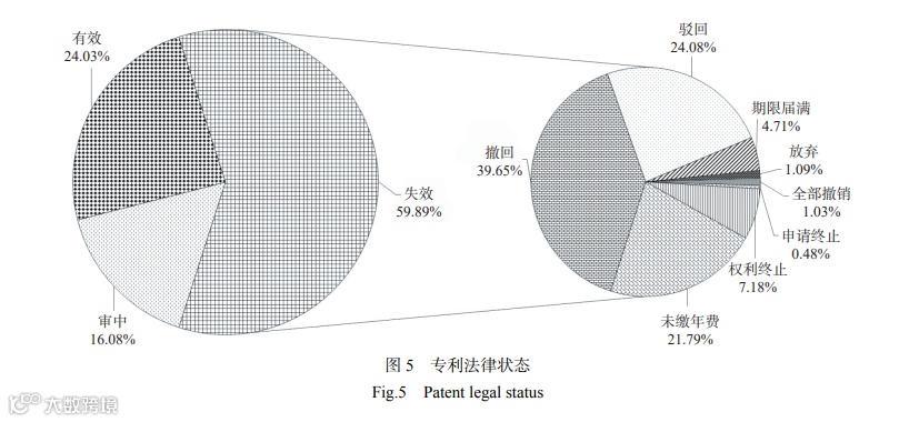 由图5可知,Nisin在食品贮藏保鲜应用领域,失效专利占59.89%,有效专利仅占24.03%。然而,63.73%的失效专利是由于专利被撤回或驳回造成的,说明该领域很多专利申请不满足专利法对新颖性和创造性的要求,缺乏技术创新性,导致专利申请人主动撤回或在审查阶段被驳回;此外,21.79%的失效专利是由于未缴年费造成的,说明该领域的有效专利维持时间较短,因为专利权人在授权专利长时间未得到转化或应用的情况下,往往会放弃其取得的专利权,以避免承担后期高昂的专利维持费用。