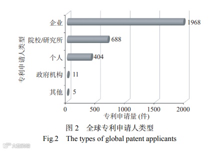 由图2可以看出,Nisin在食品贮藏保鲜应用领域,企业申请的专利数量最多,专利申请为1968件;其次为院校/研究所,专利申请为688件。由此可以看出,企业为该领域专利申请的主力军,超过一半的专利产出都来自于企业,说明该领域的专利申请偏向于应用。此外,院校/研究所在该领域技术产出方面也有一部分贡献。