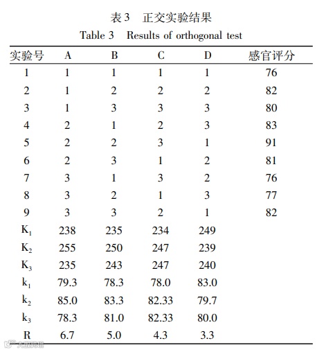 结论:通过单因素试验和正交试验确定了产品最佳配方为:黄豆与辅料总量比为7∶3,料水比为1∶10(g/mL),蔗糖添加量7%,奶粉添加量1%,红枣∶红豆∶枸杞质量之比为2∶5∶3;复合乳化剂的最佳配比为蔗糖酯∶单甘酯= 3∶4,最适添加量为0.16%;复合增稠剂的最佳配比为海藻酸丙二醇酯∶海藻酸钠∶瓜儿豆胶=2∶1∶3,最适添加量为0.065%。通过以上实验配方研制的蛋白饮料呈淡黄色、口感顺滑、具有奶香味且有较好的稳定性。