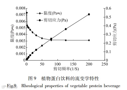 结果:通过单因素试验和正交试验确定了植物蛋白饮料影响感官评价因素大小顺序为: 原料与辅料的质量比>料水质量比>蔗糖添加量>奶粉添加量,获得最优组合是A2B2C3D1的产品感观评分为 91分,即产品的初步配方为蔗糖添加量为7%,姜汁添加量为0.05%,精盐0.04%,奶粉添加量为1%,黄豆与辅料总量比为7∶3,料水比为1∶10(g/mL),红枣∶红豆∶枸杞质量之比为2∶5∶3;通过测定产品离心前后的吸光度值来检测产品的稳定性,蔗糖酯和单甘酯总量的质量分数在0.07%~0.16%时产品的稳定性逐渐升高,在质量分数为0.16%时稳定性最好,进而确定了复合乳化剂的最佳配比为蔗糖酯∶单甘酯= 3∶4,最适添加量为0.16%;通过测定产品离心前后的沉淀值来检测产品的稳定性,结果表明产品中不添加增稠剂时,沉淀率很高,体系很不稳定。增稠剂的添加使得离心沉淀率降低,产品稳定性增高。当三种增稠剂总量的质量分数在0%~0.065%时沉淀率逐渐降低,在质量分数为0.065%时稳定性最好,添加量超过0.065%时,离心沉淀率反而略有增加,最后确定了复合增稠剂的最佳配比为,海藻酸丙二醇酯∶海藻酸钠∶瓜儿豆胶=2∶1∶3,最适添加量为0.065%。最终获得的产品含有2.14%的蛋白质、0.95%的脂肪、13.57%的可溶性固形物、0.92%的还原糖,符合QB/T 2132-2008 中对植物蛋白饮料中的蛋白质、脂肪等含量的要求;同时通过测定产品的粒径,结果表明植物蛋白饮料的粒度分布比较集中,平均分散系数为0.24,其粒径平均值也较小,值为303.33 nm,说明此产品的稳定性比较好,在长期的贮存中不易出现分层的现象。此外该产品的流变学特性的测定结果显示当试验剪切速率趋向0时,剪切应力远大于0,从另一方面也说明了该产品具有较高的稳定性,离浆分层的可能性比较小。