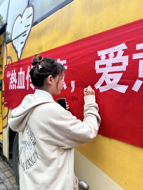 献血者们纷纷在横幅上留下自己的笔迹