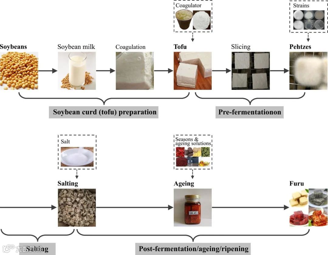 图 1. 发酵腐乳的制造过程示意图。