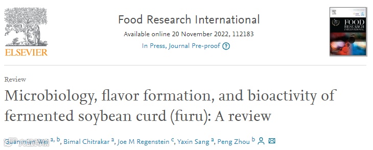 2022年11月20日,河北农业大学魏冠棉(第1作者)、江南大学周鹏*(通讯作者)等在国际食品TOP期刊Food Research International(Q1,IF: 7.425)(点击查询最新即时IF和分区)发表题为“Microbiology, flavor formation, and bioactivity of fermented soybean curd (furu): A review”的综述性论文(点击查看该刊投稿指南)。