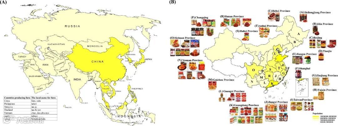 图2.(A)亚洲生产腐乳的国家的地理分布,(B)中国生产腐乳的省份的地理分布和腐乳产品的种类。