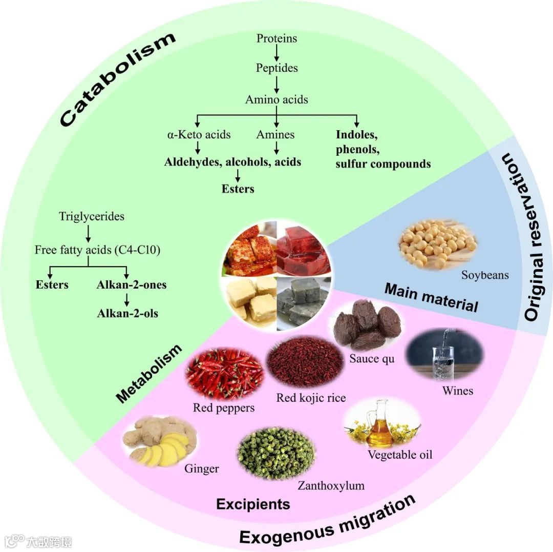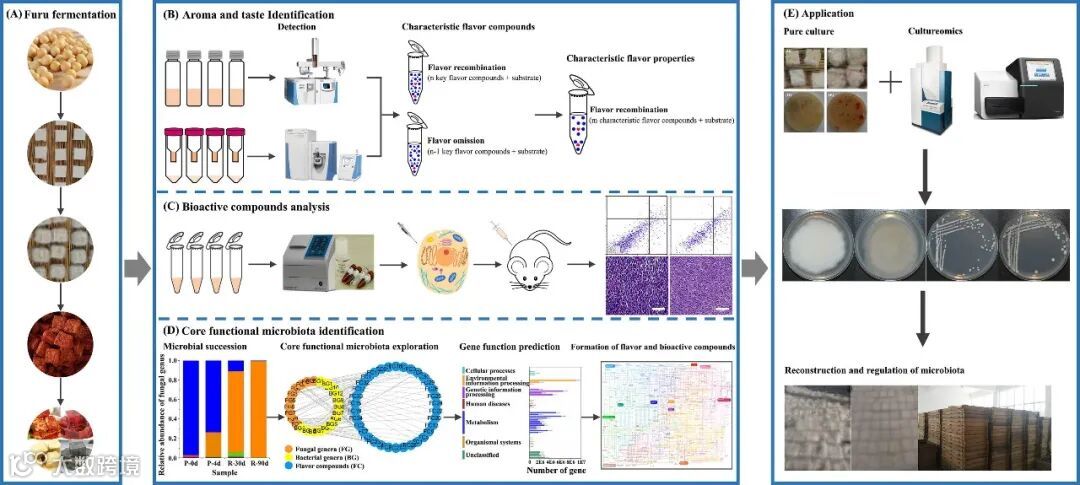 图 7. 关于风味、生物活性化合物概况和微生物系统的研究前景,以制定了解特征风味、生物活性和核心功能微生物群的策略。展示了特色风味和生物活性化合物的形成机制,以及它们在腐乳中的应用。