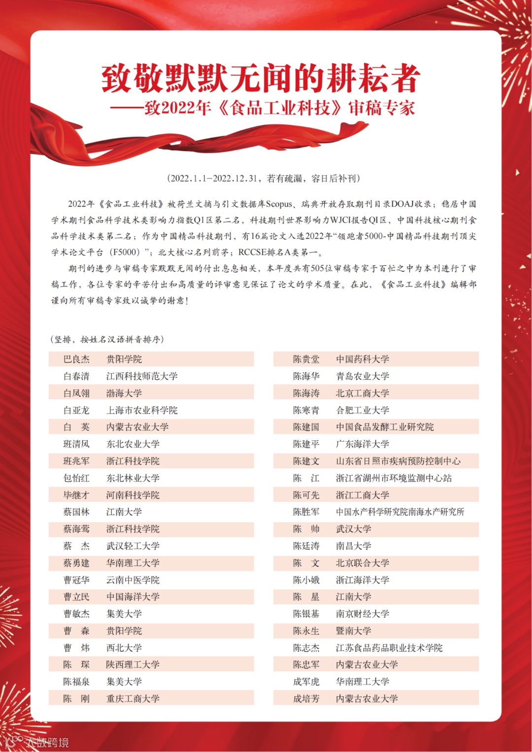 2023年44卷第4期特殊版位 | 致敬默默无闻的耕耘者——致2022年《食品工业科技》审稿专家
