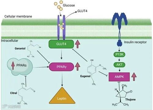 根据研究结果,肉桂醛、香芹酚、生姜酮、紫苏醇、泽隆酮、桃金娘醇、麝香草醇、香叶醇、香茅醛、丁香酚、胸腺醌、麝香草酚、香茅醇、α-萜品醇和芳樟醇等植物精油化合物,已被证明通过调节与葡萄糖代谢相关的各种信号传导途径,在相关动物模型中显示出强大的抗糖尿病作用。