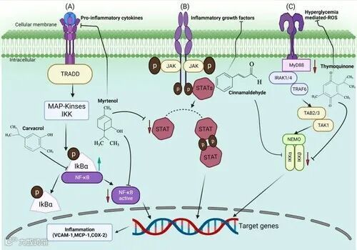 深入讨论了膳食植物精油化合物对糖尿病中炎症因子与相关信号通路的调节作用。