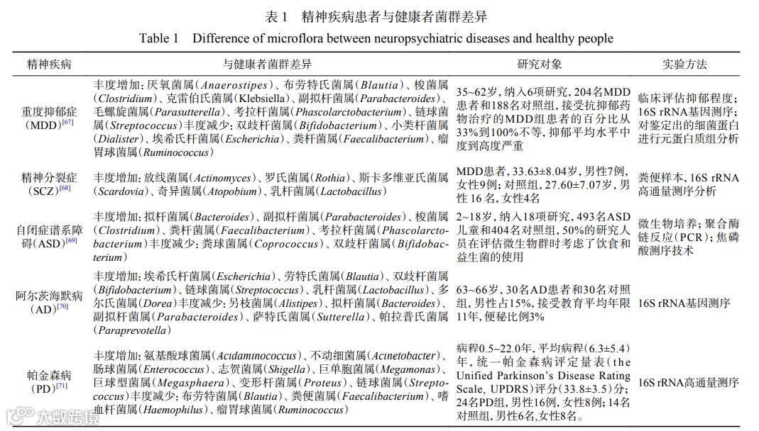 帕金森病(Parkinson’s Disease,PD)治病机制复杂,其α-突触蛋白变化是该病的重要致病机制。患者肠道菌群特征表现为碳水化合物发酵和丁酸合成能力降低,蛋白水解发酵和有害氨基酸代谢产物的产生增加。研究PD患者的肠道微生物群,发现了一些常见的微生物群落改变,如PD患者中的毛螺菌科(Lachnospiraceae)减少和疣微菌科(Verrucomicrobiaceae)增加[66],普雷沃菌科(Prevotellaceae)减少。而普雷沃菌科(Prevotellaceae)作为肠内共生细菌,可以促进肠道神经粘膜层的生成,当其减少将导致肠道通透性增加,使局部和系统受到内毒素的入侵,从而导致α-突触蛋白的错误折叠和表达。精神疾病患者与健康者菌群差异见表1。