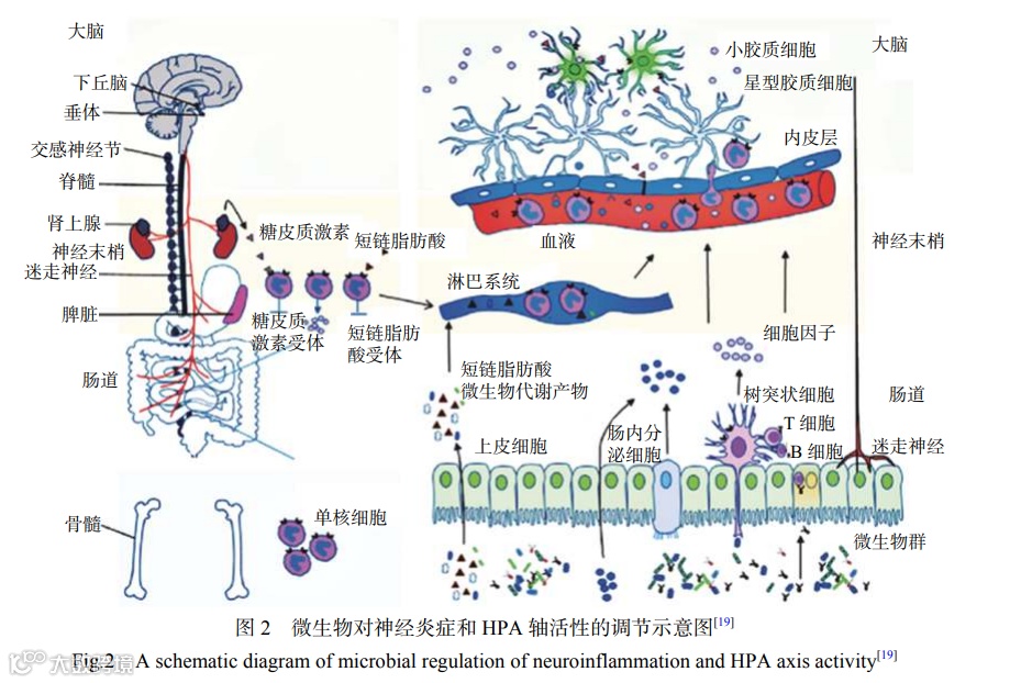 作为神经内分泌系统的下丘脑-垂体-肾上腺轴(Hypothalamic-Pituitary-Adrenal Axis,HPA),能够掌控激素对机体内外部产生的反应。肠道菌群有助于神经内分泌的成熟,微生物群可以通过各种通讯方式控制外周和中枢神经系统的活动,包括迷走神经的激活、细胞因子的产生、神经肽和神经递质的释放、短链脂肪酸的释放和微生物代谢产物的释放,并利用淋巴和体循环。若这些信号穿过血脑屏障然后到达大脑,就会使小胶质细胞激活,使其在免疫监控等方面发挥作用,包括HPA轴激活状态的调节。当HPA轴被激活,会释放出糖皮质激素,该激素能够调节大脑小胶质细胞的状态,使其激活,进而影响细胞因子的释放以及单核细胞的运输(见图2)。