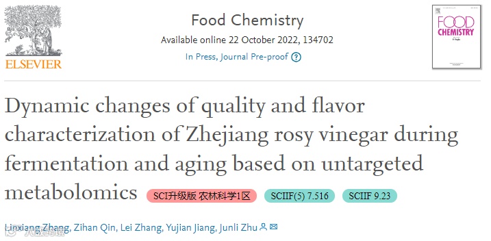 2022年10月22日,浙江工商大学朱军莉教授课题组在国际Top期刊Food Chemistry(Q1,IF: 9.231)(点击查询最新即时IF和分区)发表题为“Dynamic changes of quality and flavor characterization of Zhejiang rosy vinegar during fermentation and aging based on untargeted metabolomics”的研究性论文(点击查阅该刊投稿指南)。