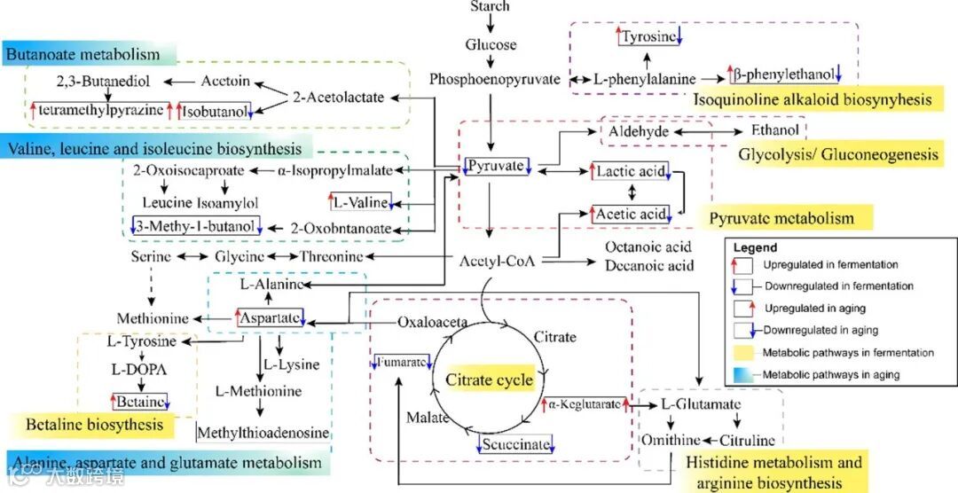与新鲜的ZRV相比,陈酿的ZRV表现出更浓郁和愉快的香气。该文共鉴定了35种挥发性化合物,酯类是ZRV的主要香气成分。糠醛、乙偶姻和四甲基吡嗪被认为是ZRV陈酿过程中的香气生物标志物。有机酸和氨基酸是ZRV中最主要的非靶向代谢物,使其具有更高的营养价值和丰富的风味。各种氨基酸代谢对醋的滋味做出了贡献,特别是组氨酸代谢和精氨酸的生物合成。此外,在传统醋中还发现了几种生物活性物质,包括阿魏酸、槲皮素、牛磺酸和甜菜碱。