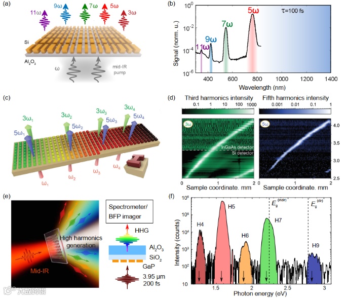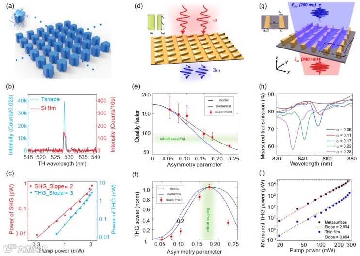在三次谐波产生方面,硅基纳米结构由于具备较强三阶非线性响应和良好工艺兼容性,成为重要研究对象。相关工作表明,通过构建具有对称性破缺的硅纳米结构阵列,可在可见和近红外波段激发高Q准BIC模式,从而显著增强三次谐波信号。