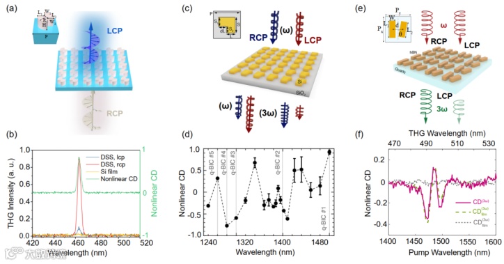 除谐波产生外,综述还讨论了准BIC在非线性手性光学中的新进展。通过引入空间不对称性结构,超表面可对左旋和右旋圆偏振光产生选择性响应,并在谐波信号中表现出明显的非线性圆二色性。这为手性分子探测、偏振调控器件以及自旋光子学研究提供了新的实现路径。