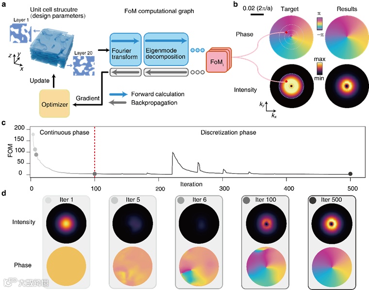 本研究提出了一套逆向设计光子晶体的算法框架,用于在动量空间中生成具有定制光学涡旋阶数、偏振的高质量涡旋光,并进一步实现了偏振与动量空间的分路复用(图1)。研究团队构建了基于反向传播自动微分的拓扑优化流程如图2a所示,以光子晶体单元中每个体素的介电常数为优化参数,采用严格耦合波分析(RCWA)进行高效模拟仿真,并结合L-BFGS-B优化算法实现高效优化设计。