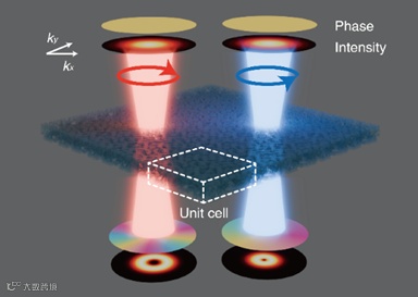 图1. 偏振多路复用的涡旋光产生。该逆向设计光子晶体可在相同波长下,针对左旋圆偏振入射高斯光束生成-1阶涡旋光,针对右旋圆偏振入射高斯光束生成-3阶涡旋光。