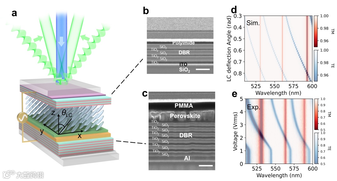 研究团队在纳米尺度下构建了液晶可调 Fabry–Perot 纳米腔结构,并将准二维钙钛矿发光材料集成其中,实现了腔模品质因子与液晶可调双折射特性的协同优化。
