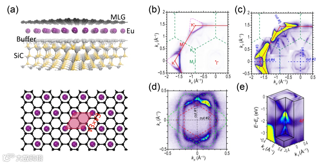 图1. (a) 碳化硅上铕插层外延石墨烯结构示意图。(b) 铕插层石墨烯费米面的角分辨光电子能谱图。(c) 信号增强的费米面能谱图。(d) 布里渊区中心折叠狄拉克费米面能谱图。(e) 布里渊区中心折叠狄拉克能带劈裂。