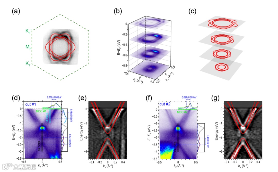图3. (a-c) 紧束缚理论计算的布里渊区中心折叠狄拉克能带的等能面及与实验结果的对比。(d-f) 紧束缚理论计算的布里渊区中心折叠狄拉克能带劈裂机构及与实验结果的对比。理论和实验呈现出高度一致性的结果。