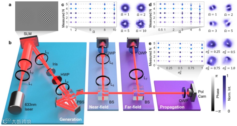 图4:厚介质湍流中的斯格明子。(a) 模拟100米信道、5个相位屏的几何示意图。(b) 不同湍流强度下LG2模式的强度分布示例。(c) 不同N的斯格明子输出拓扑荷数随Rytov方差σR²的变化。