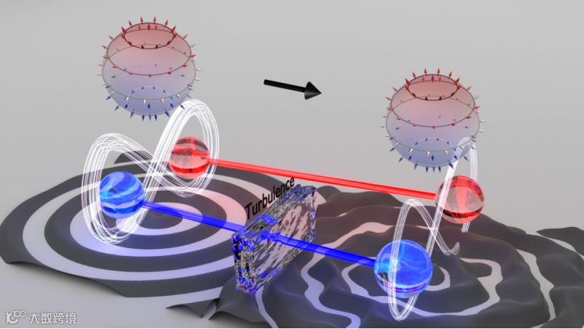 图1:经典与量子斯格明子在湍流中的示意图。在非局域量子情形中,蓝色和红色球体分别代表携带OAM的光子A和携带偏振信息的光子B。在经典类比中,它们对应光束的OAM和偏振自由度。尽管湍流会降低量子纠缠或经典相关性,但斯格明子数始终保持不变。