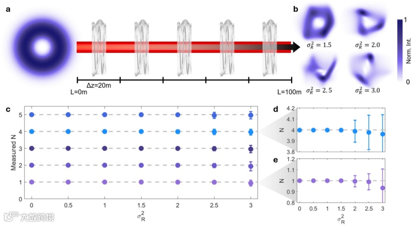 为进一步模拟真实的长距离大气链路,研究团队还进行了多相位屏的数值波传播模拟,总信道长度达100米(图4)。结果显示,即使在导致光束严重畸变的强湍流(Rytov方差高达3.0)下,所有被测拓扑荷数的斯格明子(N=1到5)的输出拓扑荷数依然稳定在理论值附近,展现出极强的生存能力。