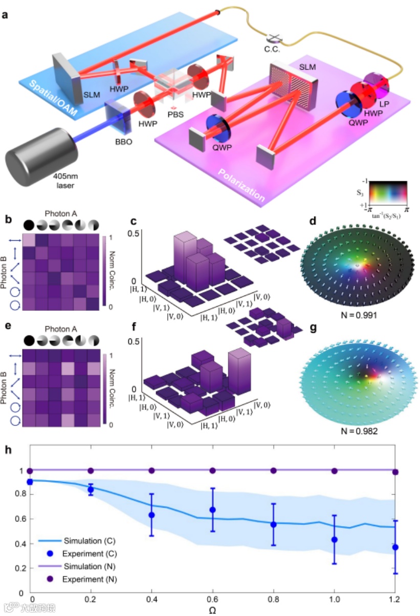 实验利用自发参量下转换产生纠缠光子对,通过精密调控构建了非局域量子斯格明子态。当将其通过模拟湍流后,量子态层析结果显示,尽管光子对的纠缠度(concurrence)随着湍流增强而迅速下降,但由斯托克斯参数重构的斯格明子场的拓扑荷数N却始终保持不变(图2h)。这意味着,即使量子关联本身是脆弱的,但编码在全局拓扑结构中的信息却得到了保护。