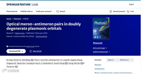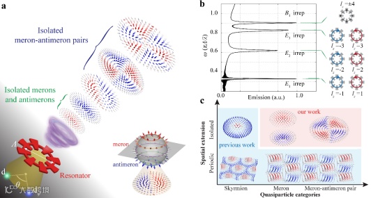 近日,空军工程大学王甲富教授、杨杰副教授、富新民副教授团队,南京航空航天大学郑学智教授团队,联合东南大学崔铁军院士及新加坡国立大学仇成伟教授团队,在光学拓扑准粒子研究方面取得重要突破,在《PhotoniX》上发表了题为“Optical meron-antimeron pairs in doubly degenerate plasmonic orbitals”的研究论文。该工作首次在实验上证实了光学系统二重轨道简并态中普遍存在一类新的拓扑准粒子——半子-反半子对(meron-antimeron pairs),以局域表面等离激元系统为例,讨论了其内存在的时谐半子-反半子对、靶型半子反半子对、孤立的半子和反半子等多种准粒子拓扑构型,建立了基于群论的拓扑准粒子对称性分类表,揭示了其拓扑不变量与系统轨道角动量指标之间的严格对应关系。研究进一步展示了该型准粒子对形变与扰动的强鲁棒性,并挖掘了其在极深亚波长传感(分辨率达λ/133) 中的应用潜力。