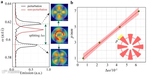 研究通过引入几何扰动(如扇形缺陷)验证了半子-反半子对的强鲁棒性:即使对称性被部分破坏,其拓扑构型仍得以保持,但会引起额外的谐振频率分裂效应(Splitting effect of resonant frequencies)。该频率分裂效应与扰动尺寸呈敏感对应关系,数值模拟结果展示了基于二阶半子-反半子对的长度传感分辨率可达λ/133。