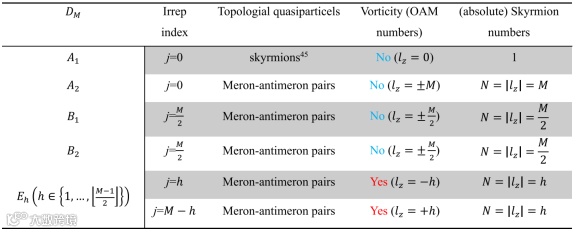 表1:光学拓扑准粒子作为 DMDM群不可约表示的对称性分类表示例