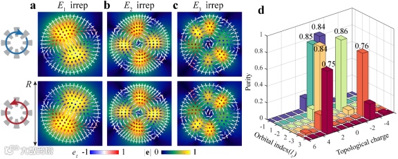 研究团队基于具有8重旋转对称性的金属环谐振器,利用群论方法分析了其本征态所属的不可约表示(irreps)。通过设计双点源激励并满足对称匹配条件,成功在二重简并轨道中激发出一类新型光学拓扑准粒子——半子-反半子对。研究发现,其绝对斯格明子数(absolute skyrmion number)严格由不可约表示的轨道角动量指标决定: