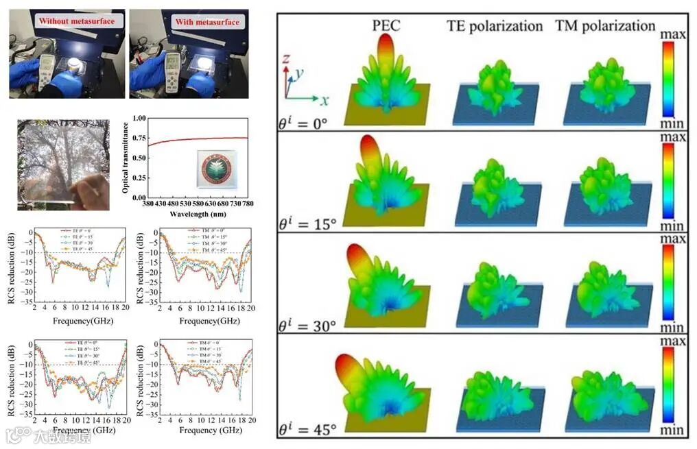 基于所提出的混合 AI 逆向设计框架,研究团队设计并制备了光学透明超宽带隐身超表面。该结构采用聚对苯二甲酸乙二醇酯(PET)与氧化铟锡(Indium Tin Oxide, ITO)料体系,在保证电磁性能的同时,实现了优异的光学透明特性。电磁测试结果表明,该超表面在 3.7 GHz–18.7 GHz 的超宽频段内实现了超过 10 dB 的 RCS 减缩,相对带宽高达 133.9%。此外,在 0°–45° 斜入射范围内,无论是 TE 还是 TM 极化波,该超表面均保持稳定且一致的宽带隐身性能,充分验证了所提出混合 AI 逆设计方法在复杂电磁环境下的可靠性与工程适用性。