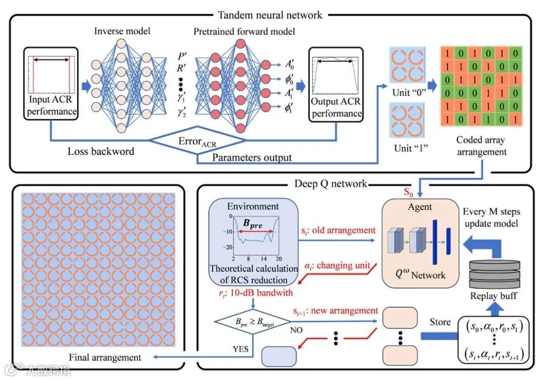 针对上述关键瓶颈问题,本研究提出了一种混合人工智能(Hybrid AI)驱动的超表面逆向设计框架。该框架创造性地将串联神经网络(Tandem Neural Network, TNN)与深度 Q 网络(Deep Q-Network, DQN)相结合,分别用于解决连续变量主导的单元结构参数逆向设计与离散变量主导的阵列排布全局优化问题。通过在统一设计框架中协同引入电磁吸收、极化转换与相位对消等多物理机制,实现了兼具光学透明特性与超宽带电磁隐身性能的超表面结构设计,为复杂电磁功能器件的智能化设计提供了一种高效、可扩展的新范式。