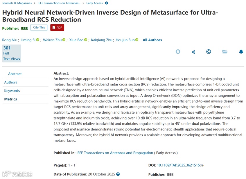 Niu R, Si L M, Zhu W R, Bao X, Zhu K Q, Sun H J, Yang F. “Hybrid Neural Network-Driven Inverse Design of Metasurface for Ultra-Broadband RCS Reduction”, IEEE Transactions on Antennas and Propagation, DOI: 10.1109/TAP.2025.3621515, 2025.